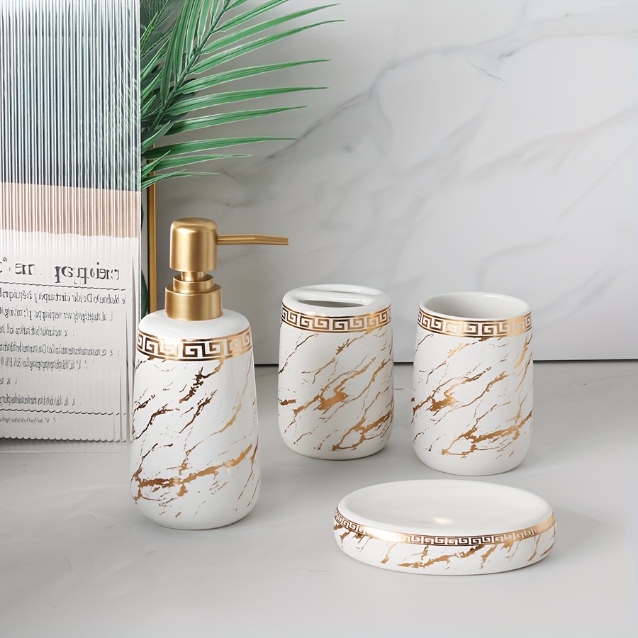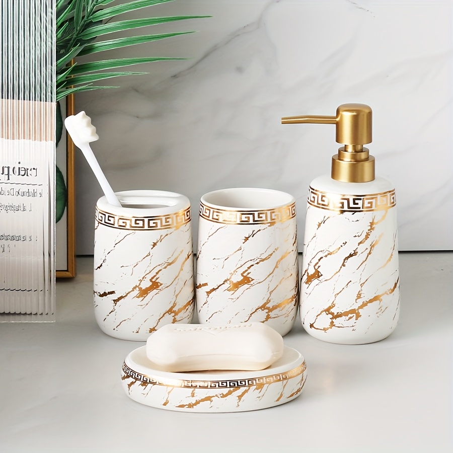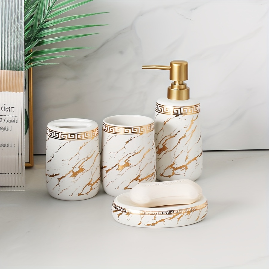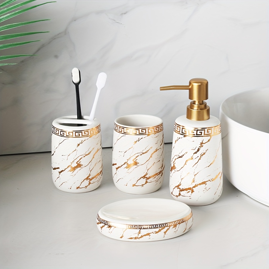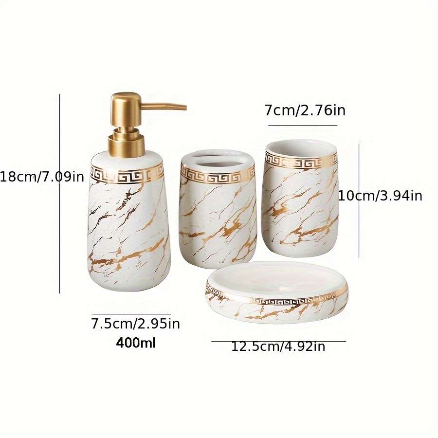Packaging Includes: 1 Hand Soap Dispenser, 1 Toothbrush Holder, 1 Soap Dish, 1 Mouthwash Cup