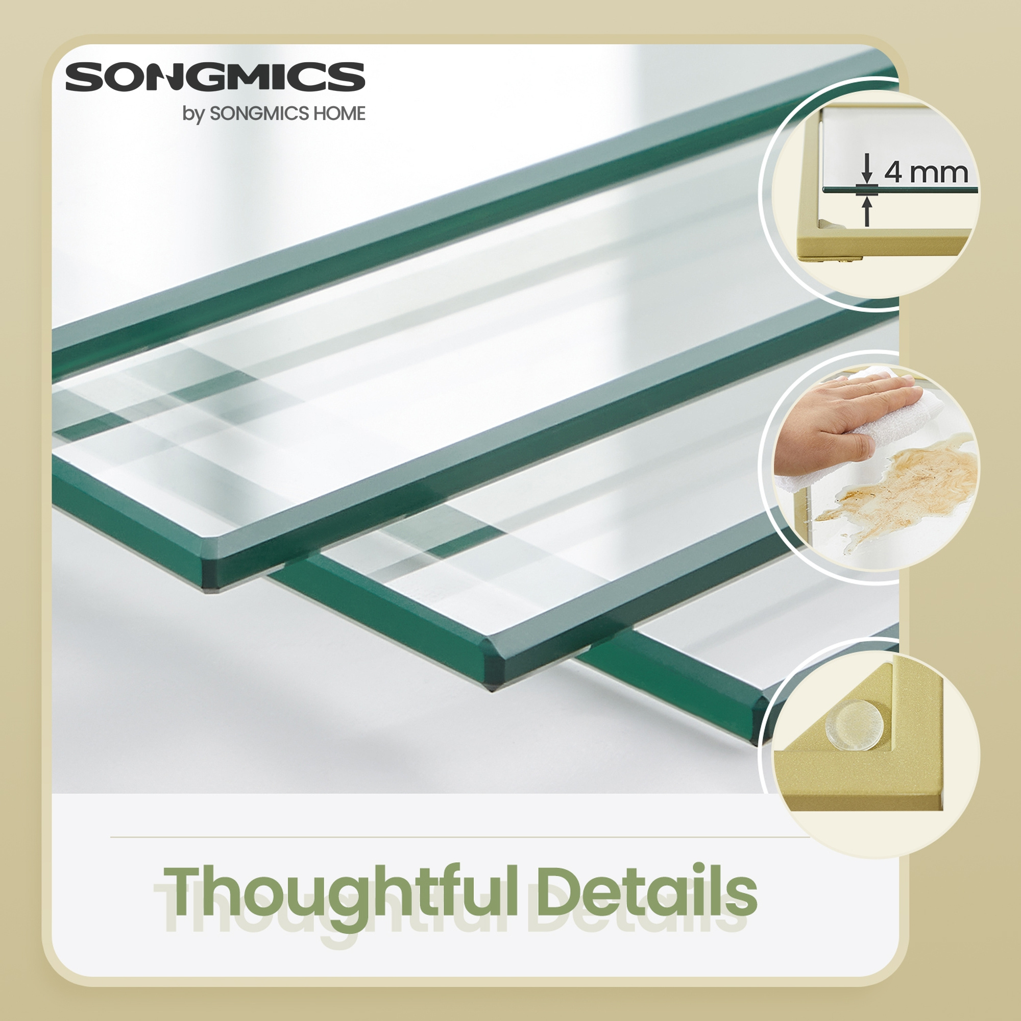 Specifications: – Color: Pale Gold – Material: Tempered Glass, Steel – Product Size: 11.8″D x 15.7″W x 69.8″H (30 x 40 x 177.3 cm) – Product Weight: 21.8 lb (9.9 kg) – Max. Static Load of Each Shelf: 22 lb (10 kg) – Total Max. Static Load Capacity: 132 lb (60 kg) Package Contents: – 1 x Storage Rack – 1 x Anti-Tip Kit – 1 x Accessory Kit – 1 x Instructions Notes: – Please secure this shelving unit to the wall with the included anti-tip kit for safety. – Please follow the instructions to assemble this storage rack. Do not DIY or stack several racks.