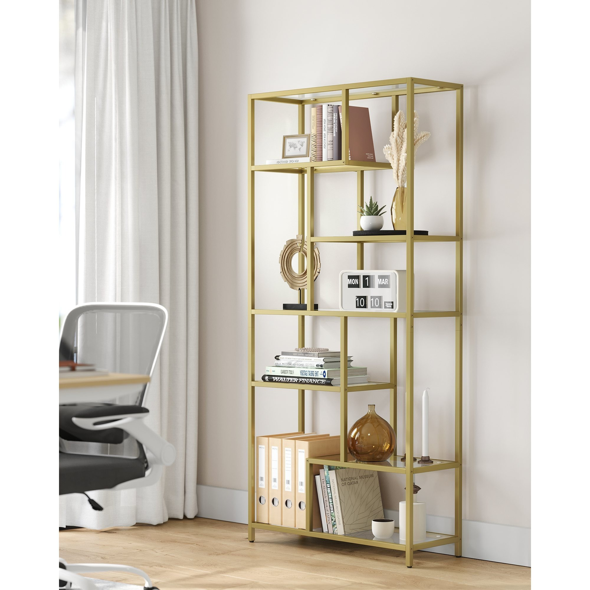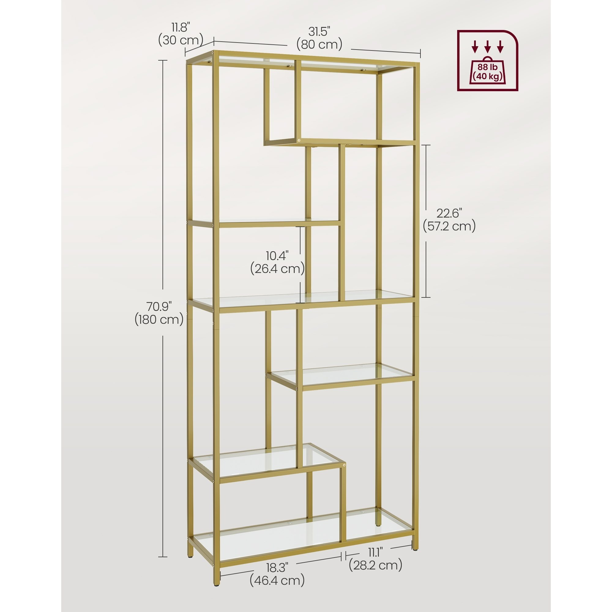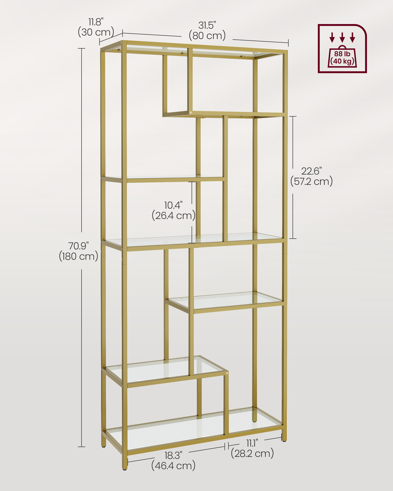 Specifications: Color: Metallic Gold Material: Tempered Glass, Steel Product Size: 11.8″D x 31.5″W x 70.9″H (30 x 80 x 180 cm) Product Weight: 40.8 lb (18.5 kg) Max. Static Load Capacity: 88 lb (40 kg) Package Contents: 1 x Bookshelf 1 x Anti-tip Kit 1 x Accessory Kit 1 x Instructions