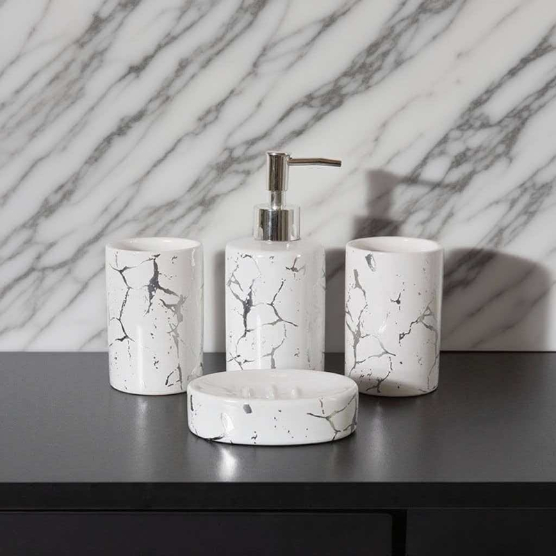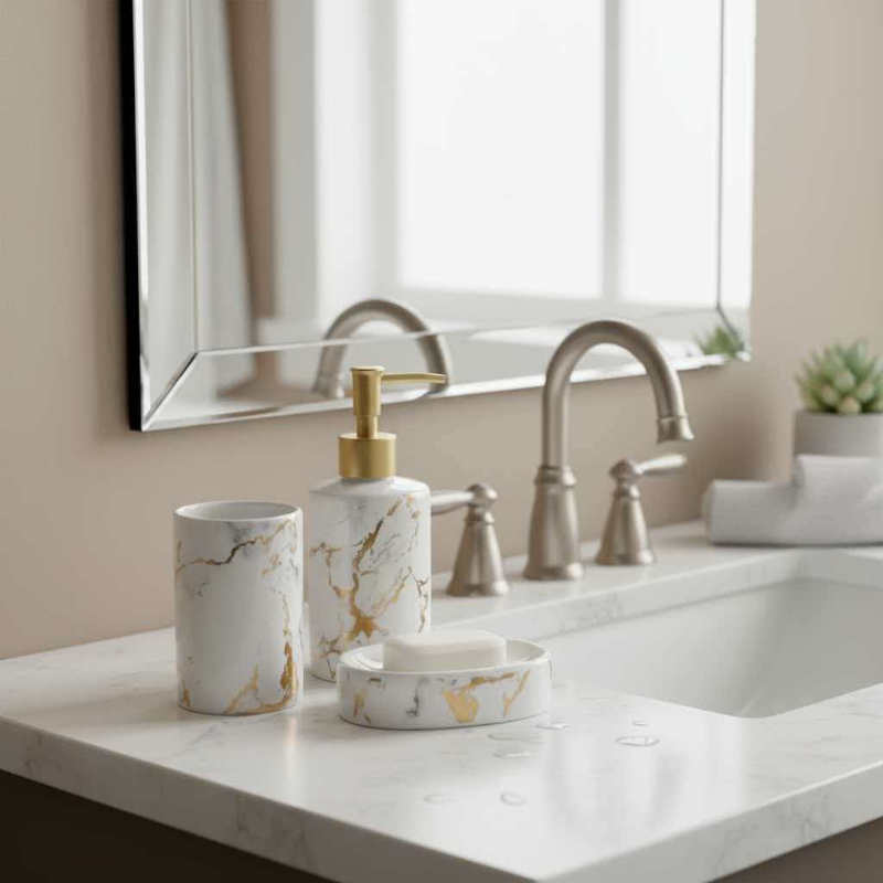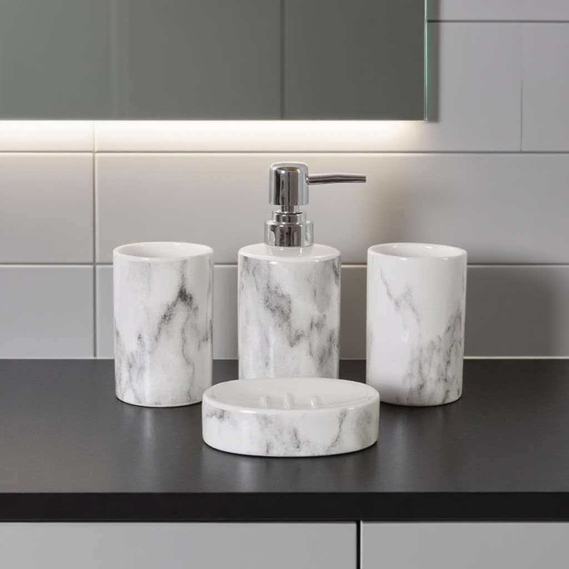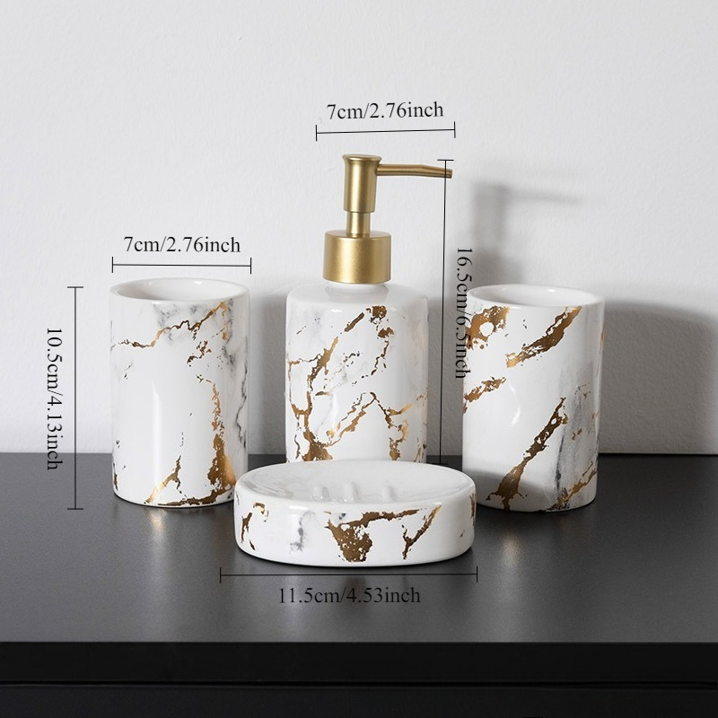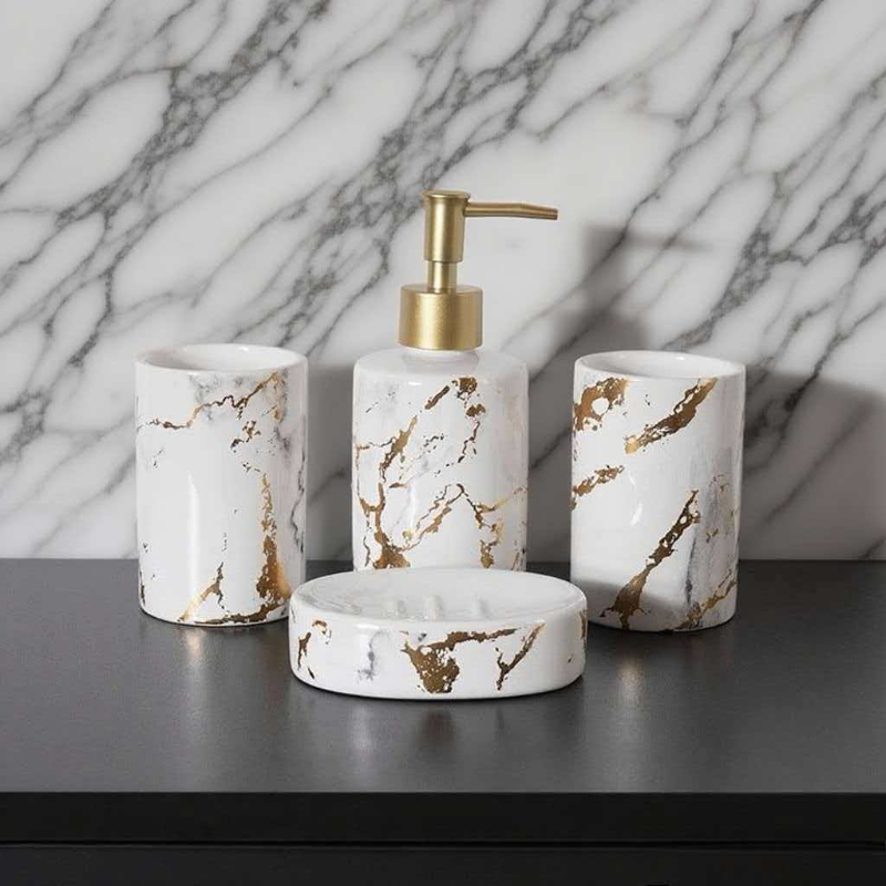 1 review for Four-Piece White Golden Textured End Marble Bathroom Set