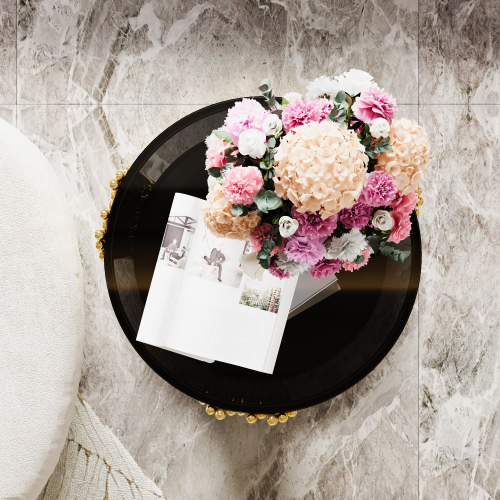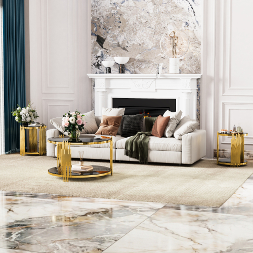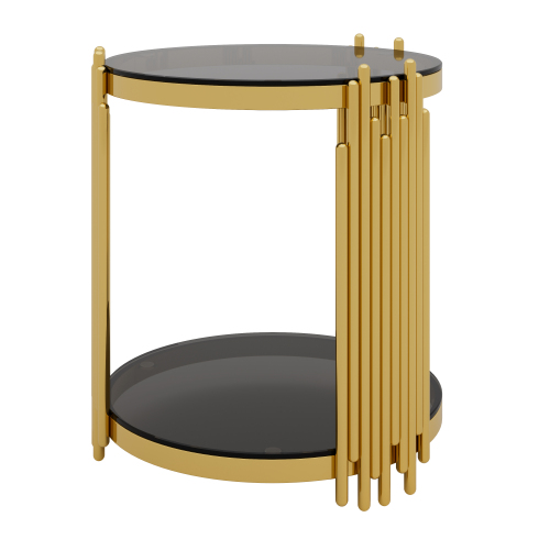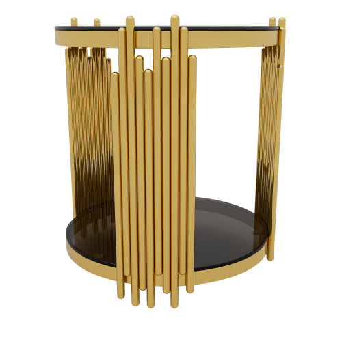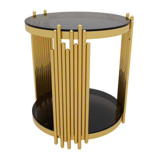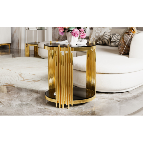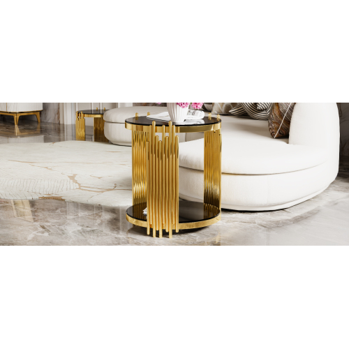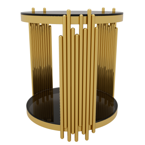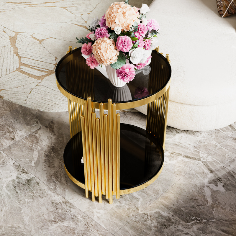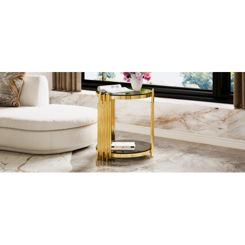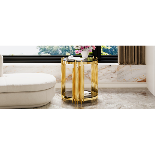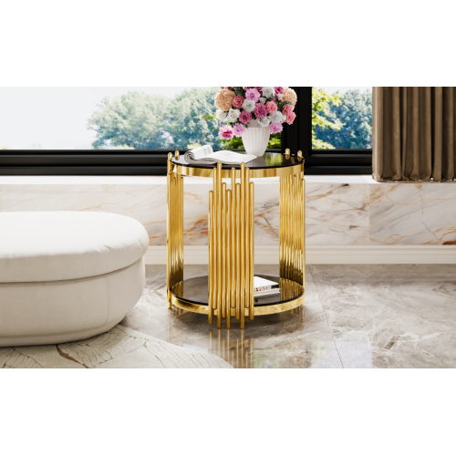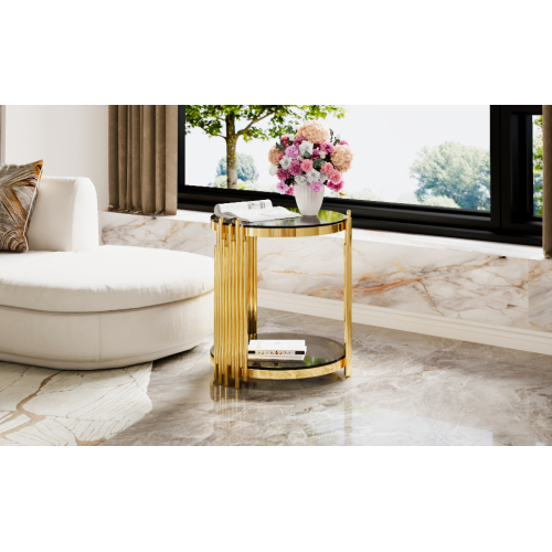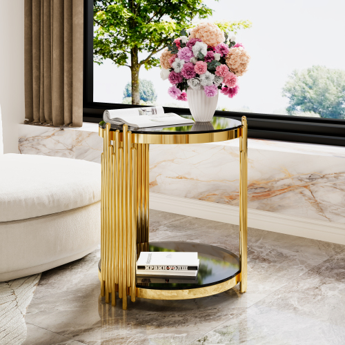 e a sculptural statement piece. Gold-Finished Metal Base — The metallic gold finish adds elegance and luxury, offering a striking contrast to the black mirror top for a glamorous vibe. Lower Shelf for Extra Storage or Display — A shelf beneath the main surface provides additional space for books, magazines, remotes, decorative items, or a small plant. Open, Airy Structure — The open-frame design and round mirrored top keep the table visually ligh